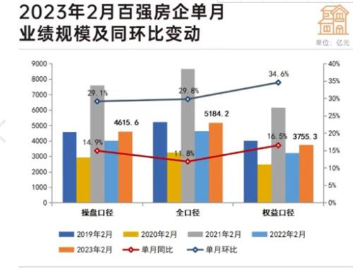 根据数据资料的统计,2月单月房企的销售业绩出现了同环比双增长的局面,百强企业单月销售业绩,环比增长了29.1%,同比增长了4.9%,前两个月百强仿写操盘销售的业绩金额相对比之前一个月下降幅度减缓,前两个月百强房企的操盘销售金额为8189.5亿元,今年前两个月的销售金额为9841.1亿元,环比上涨了35.1%,同比上涨幅度为28.5%,前两个月百强房企销售榜的前三名分别为保利房产和万科房产,还有碧桂园,去年碧桂园一直是排在销售榜首,今年已经下滑至第3位。