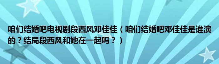 大家好,小安来为大家解答以上问题。咱们结婚吧电视剧段西风邓佳佳,咱们结婚吧邓佳佳是谁演的?结局段西风和她在一起吗?很多人还不知道,现在让我们一起来看看吧!