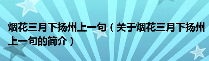 大家好,烟花三月下扬州上一句,关于烟花三月下扬州上一句的简介很多人还不知道,现在让我们一起来看看吧!