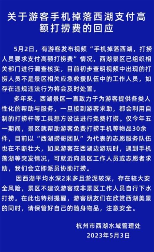 5月2日,有游客发布视频称其手机掉进了杭州西湖,被一名衣着上写有“应急救援”的男子索要1500元打捞费,甚至威胁说若未打捞成功则只需支付一半费用。对此,杭州市西湖水域管理处于5月3日做出回应,称已组织相关部门调查核实此事件。经初步查明,视频中的打捞人员并非景区相关应急救援队伍的工作人员,若存在违规违法行为将会被及时处置。
