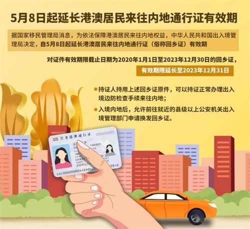 中华人民共和国出入境管理局日前发布公告,宣布自5月8日起将证件有效期限截止日期为2020年1月1日至2023年12月30日的港澳居民来往内地通行证(俗称回乡证)的有效期限延长至2023年12月31日。记者今天从出入境管理局了解到,政策实施的各项准备工作已经就绪。