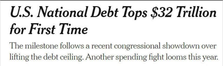 据《纽约时报》报道,美国财政部最新公布的数据显示,美国国债首次突破32万亿美元,比之前预测的时间提前了9年。经济低迷背景下,美国政府为应对新冠疫情的紧急支出是导致这一情况的主要原因。随着新冠纾困法案、基础设施建设法案等措施的出台,拜登政府为筹集资金而不断增发债券。而美联储多次激进加息也导致美国政府债务利息的上升。根据去年10月财政部公布的数据,美国政府债务规模首次超过31万亿美元。