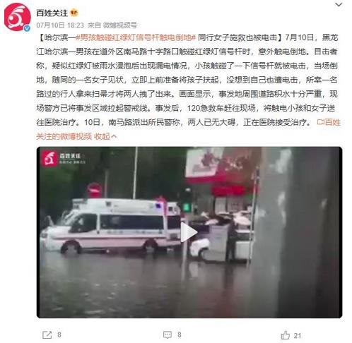 哈尔滨一男孩在道外区南马路十字路口触碰红绿灯信号杆时,意外触电倒地。据目击者称,雨水浸泡导致红绿灯发生漏电情况,男孩在触碰信号杆后受到电击。一位同行女子立即上前扶起男孩,却也遭到电击。幸运的是,一位路过的行人拿来扫帚将两人拽出。事发地周围道路积水严重,警方已拉起警戒线。