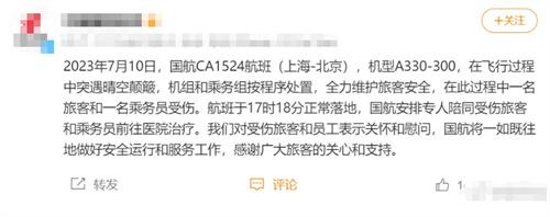 2023年7月10日,中国国际航空(以下简称国航)CA1524航班在上海飞往北京的途中遭遇了一次意外的晴空颠簸。这次事件使得一名乘务员和一名旅客受伤,但由于机组和乘务组的紧急处置,航班最终安全落地。