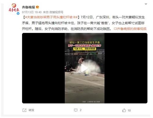 据报道,7月12日,广东深圳市一幕令人震惊的场景发生在街头。一对夫妻之间的争执逐渐激化,导致了一起意外事件。男子情绪失控,突然用头猛撞向栏杆,结果不幸被卡住无法自行脱困。
