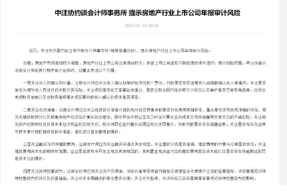中国注册会计师协会于3月30日发布消息称,中注协已书面约谈立信中联会计师事务所(特殊普通合伙),提醒其关注房地产行业上市公司年报审计风险。