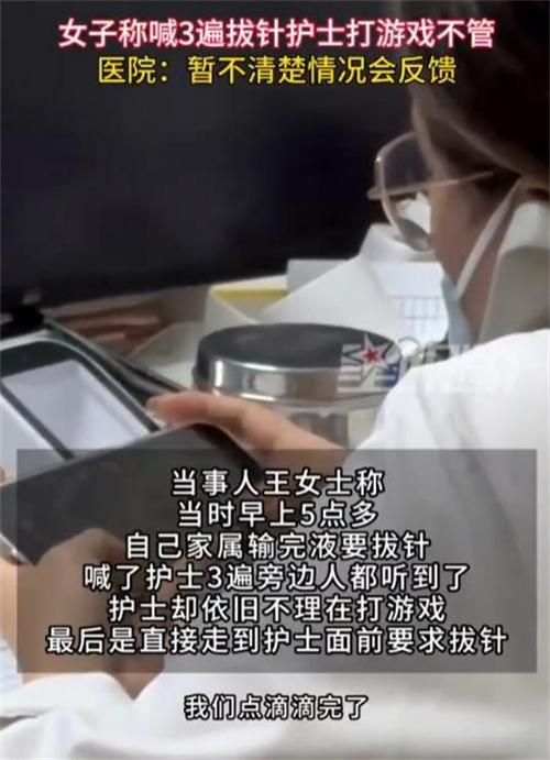北京时间6月21日,福建泉州的王女士称带家人去东南医院挂夜间急诊看病,遇到值班护士一直打游戏,工作懈怠,这件事情也是引发了网友们的广泛关注。于是表示自己的家属在输完液以后要拔针,喊了护士三遍,但他一直都在打游戏,最后直接走到护士面前要求拔针,对此自己感到十分的生气,觉得夜班辛苦,打游戏放松可以理解。但是希望病人有需要的时候可以及时停下,对于这件事,医院也进行了回应,值班人员已经换班,暂时不清楚情况,了解以后会给领导进行反映。