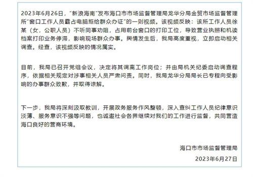 6月26日的下午,有一名网友在自己的社交平台上发布了一条视频,在该条视频里面这名网友表示位于海南省海口市市场监督管理局龙华分局经贸监督管理所的一名普通员工,霸占电脑拒绝给群众办证,这条视频在发出之后,立刻被社会各界多方转发,也让社会各界对于此事进行了深入思考。北京时间6月28日,记者也和海口市市场监督管理局取得了联系,从海口市市场监督管理局处了解到,这一事情已经做出了进一步的处理,目前这名女性员工已经正式被停职,员工的领导也被免职了。
