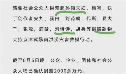 近期,河北涿州由于洪涝的灾害受到了外界的广泛关注。也有很多企业明星纷纷向河北涿州地区进行了贷款,展示了自己对于灾区人民的帮助以及关怀之情,然而伴随着一份捐款名单的出现,也立刻引起了网友们的深入关注。份名单引起观众的主要原因主要在于在该款名单中,已婚的刘诗诗在捐款的时候并没有以夫妻双方的名义,而是以自己的个人名义去进行捐款,在捐款名单中也并没有看到她的丈夫吴奇隆的名字,上的这一情况也立刻引发了媒体人的多方猜测,甚至有很多人怀疑两个人的婚姻关系是不是出现了问题。
