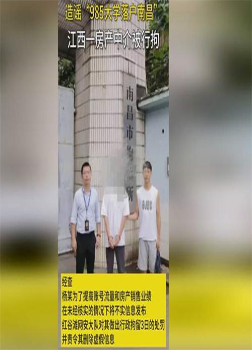 之前某网民在网络上发布视频宣称一所985大学将会在南昌落户,并且称南昌政府出资人民币150亿,已经划拨好了土地,进行高效的建设,并且已经规划了地铁口。此消息已经被证实是某房产中介为了博取流量,提升房产销售的业绩而发布的虚假信息。江西一名房产中介已因此被捕。