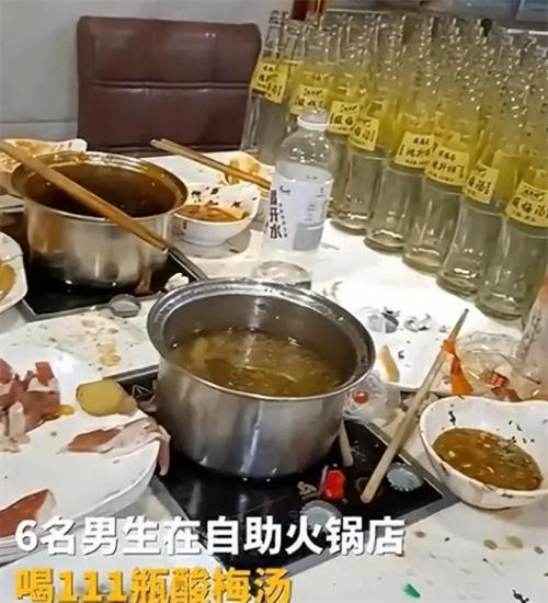10月10日,在陕西西安的一个自助火锅店内,6名男生一共喝了111瓶酸梅汤,令在场的众人表示震惊。店方回应称26元的自助餐包括饮料的费用,这几个小伙子特别能喝,第1次见喝这么多饮料。