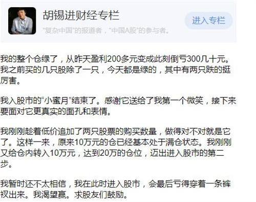 胡锡进在自己的个人账号上发布了自己的亏损情况之后,随后又表示自己虽然不知道市场的信息到底需要如何才能得到刺激,但是自己依旧始终相信股票市场的整体表现和实际情况并不会有过远的偏差。虽然我现在的亏损已经高达了6%,但是自己在股市上依旧不会选择逃走,自己会在股市上进行等待,等待股市恢复的到来。