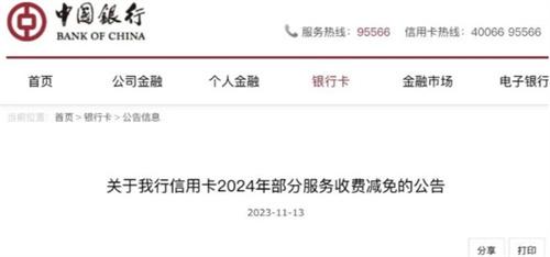 中国银行所发布的信用卡2024年部分服务收费减免的公告,在这份公告中表明,对部分信用卡的服务费进行减免,减免的服务项目,其中包括了使用自有资金在柜台取现手续费、转账转出手续费和提前换卡的手续费等等,总共减免了11项费用。中国银行官方还表示,本次减免部分服务费用是阶段性的费用优惠,时间是2023年1月1日至2024年12月31日。