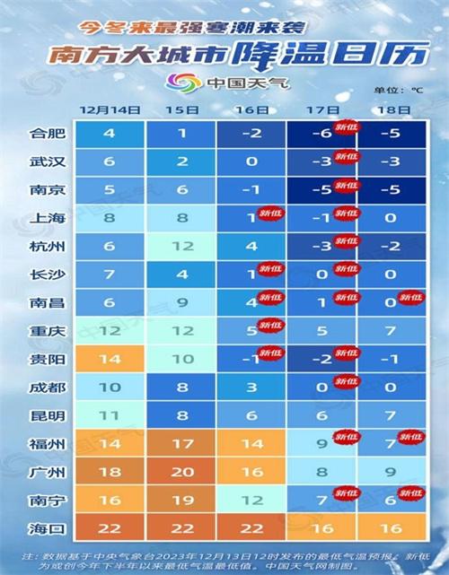 北京时间12月13号,根据中国天气网发布的消息称,今年入冬以来最强的寒潮目前已经启动,这一次的很长时间将会持续到12月16号,而且寒潮的目标将会从西方往东方,从北方往南方的方向去进行,我国部分城市的气温下降程度可能会有14℃左右。对于一些北方城市来说,这一次气温下降,有可能会突破所在城市的一个极值,而南方地区极有可能会出现气温大幅度的下降,在此要提醒所有的市民朋友们,一定要做好防寒保暖。