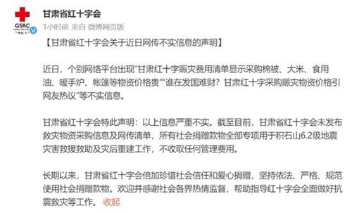 甘肃省红十字会官方表示,从赈灾开始,他们从来没有在网络上面发布过任何的物资采购信息以及清单,所有社会捐赠的款项全部都用在了6.2级地震灾害救援活动中,同时红十字会表示不会去收取任何的管理费用。而且红十字会接受社会援助一直都是合理合法并且合规的,并没有出现过任何乱用和胡用的情况,也请社会的所有网友进行监督,这样也能够让红十字协会对赈灾工作做得更好。从红十字会发布的这一篇声明当中可以看得出,他们从来没有泄露过物资采购清单,所以网络上面的信息全部都是虚假的,也请大家不要去相信。