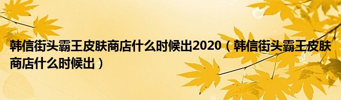 大家好,小安来为大家讲解下。韩信街头霸王皮肤商店什么时候出2020,韩信街头霸王皮肤商店什么时候出很多人还不知道,现在让我们一起来看看吧!
