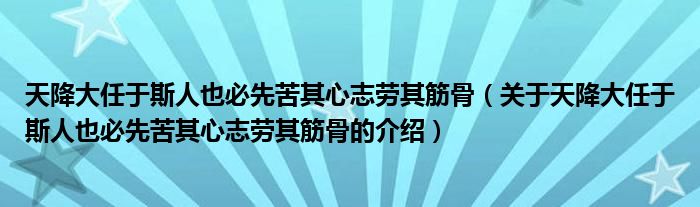 大家好,小安来为大家解答以上的问题。天降大任于斯人也必先苦其心志劳其筋骨,关于天降大任于斯人也必先苦其心志劳其筋骨的介绍很多人还不知道,现在让我们一起来看看吧!