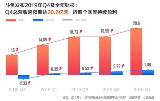 斗鱼发布了2019年第四季度及2019年全年未经审计的财务报告。财报显示,2019年第四季度,斗鱼总营收达20.6亿元,较2018年同期增长77.8%,毛利润同比增长超9倍,毛利率从去年同期的3.1%猛增至18.2%。非美国通用会计准则下录得净利润1.86亿元,较去年同期增长180%,连续四个季度盈利。