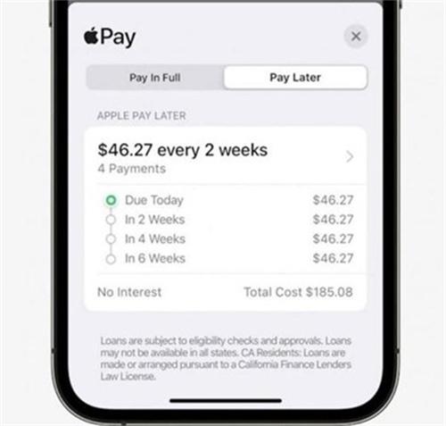 苹果公司的Apple Pay功能推行的"先买后付"方式,具体包含可以帮助用户申请50~1000美元的贷款,利用苹果或者iPad上的Apple Pay付款,选择商家,在线购买,在iPhone或者iPad商城应用内购买。不同的用户根据财务状况可以申请到的贷款有所区别,在钱包之内可以具体的查看贷款的金额和管理,也能使用不同的分期方式偿还"先买后付"的贷款。苹果公司的"先买后付"服务,开通之后会邀请一部分用户使用"先买后付"的预计版本体验。用户体验时利用此服务的改进方案,预计在不久的几个月之后将推出正式版本,以符合所有用户的需求。