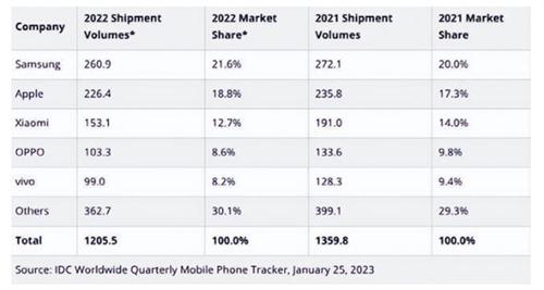 具体到第四季度,小米集团实现的总收入为660.47亿元,同比下滑了22.82%;经调整后的净利润为14.61亿元,同比下滑了67.36%。小米的营收大幅下滑,主要是受到手机业务疲软表现的影响,因为小米集团总营收超过五成的收入来自手机业务,而该业务在2022年的业务收入为1672亿元,同比下降了19.9%。不过在2023年一季度,小米手机销量有所提升,全球销量排名第三。