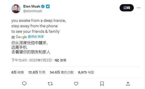 马斯克不仅以限制第三方抓取推特数据为理由限制用户的浏览量,还在推文中补充说:“我限制推文浏览量的原因是因为我们都对推特上瘾了。每天我们都在沉迷于虚拟世界。我这样做是为了对这个世界做一件好事,我们应该远离手机,多参与社交活动,多与朋友和家人交流。”马斯克在推文的最后还开玩笑说:“你又使用了一次浏览次数。”