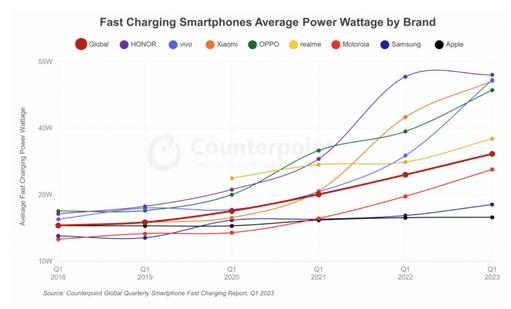 根据报告数据显示,2023年第一季度,全球快速充电智能手机的平均功率达到34W。值得注意的是,许多熟悉的品牌如小米、OPPO、vivo、荣耀等均位于平均功率线之上,展现出强大的快充技术实力,而苹果和三星则位于平均功率线以下。