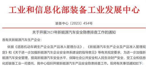 近期,我国工业和信息化装备工业发展中心官方发布《关于开展2023年新能源汽车安全隐患排查工作的通知》,内容指出官方将会组织相关机构和工作人员开展有关于新能源汽车的安全隐患检查工作。