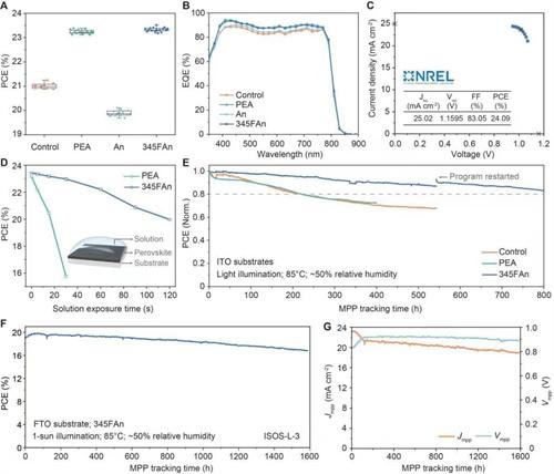 为了可以解决PSC的稳定性,瑞士洛桑联邦理工学院与其他的大学团队合作,利用氟化苯胺将PSC的效率提升至24.09%。在85℃的条件下实现PSC光照下1560小时的连续稳定性,效率衰减只有15%。