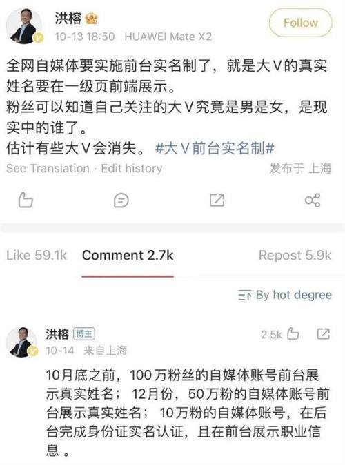 10月17日有一位微博粉丝数量超过700万的博主表示,自己已经收到了微博平台要求进行前台实名制的通知。之前有一名10名为洪榕的财经博主表示:“10月底之前100万粉丝的自媒体账号前台展示真实姓名,12月份,50万粉的自媒体账号前台展示真实姓名,10万粉的自媒体账号在后台完成身份证实名认证,且在前台展示职业信息”。