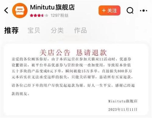 淘宝母婴店铺Minitutu因为优惠券设置错误,在双11期间短时间内被抢了15多万单,损失高达800万元。店铺的负责人告诉记者,这些订单当下全部未发货,而且店铺当中的所有商品已经下架。现在的处理方式是官方准备关闭店铺,导致有大量的消费者投诉至淘宝官方平台客服以及消费者热线12315。官方优惠券设置错误,最终选择通过不发货来处理,平台的店铺保证金已经全部被扣完,同时,商家希望消费者可以选择主动退款。