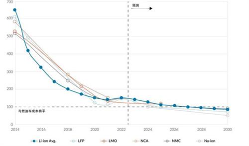 随着动力电池产能不断提升,新能源汽车电池包的平均成本已经从2015年时的每千瓦时400美元降低到了2021年时的每千瓦时140美元左右。到了2022年,因为受到供应链和锂材料成本的影响出现了反转,不过随着原材料价格逐渐回落,电池价格到2023年又重新恢复了下滑趋势。