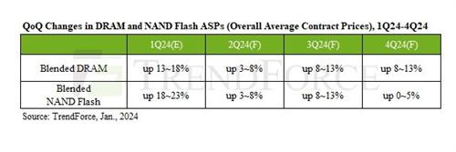 TrendForce研究数据显示2024年第一季度已经成为增长季,DRAM合约价格当季的增长幅度大约是13%~18%。NAND Flash当季的增长幅度大约是18%~23%。