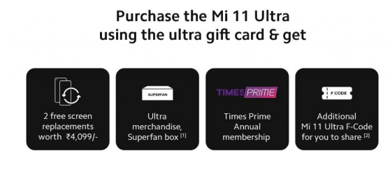 小米 11 Ultra 发售当日,凡使用 Ultra 礼品卡完成购买的用户,将获得两次免费更换屏幕、Ultra 品牌商品、Times Prime 年度会员、Superfan 礼盒和额外的 Ultra f-代码。小米米11 Ultra