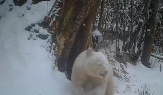 回顾到2019年4月,位于四川卧龙国家级自然保护区海拔约2000米的一台野外红外触发相机首次记录下了一只白色大熊猫的侧影。在接下来的近两年时间里,这只白色大熊猫频繁出现在红外触发相机的镜头中,或在雪地中漫步,或在河沟边思考,它穿越茂密的森林和小溪,给人们留下的都是背影的形象,或是一闪而过的臀背部。