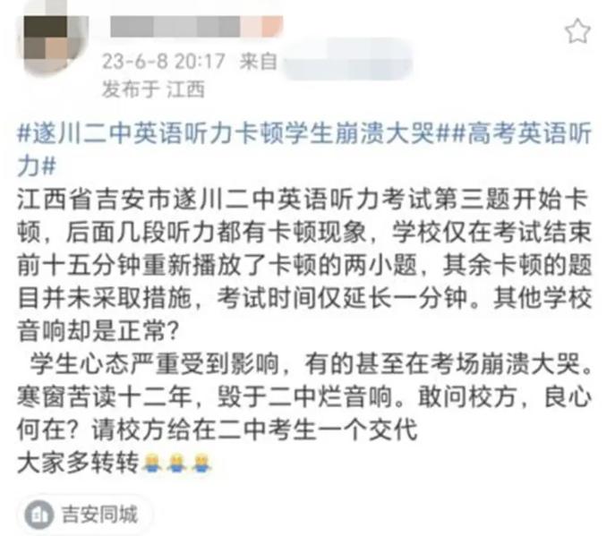 有报道显示,遂川二中考点的考生们表示,在英语听力考试中,大约有10道题目出现了卡顿现象。在下午16时30分,广播宣布将重新播放听力内容,而在16时45分,重新播放了其中的两道题目。这样的情况导致许多学生含着眼泪离开了考场。