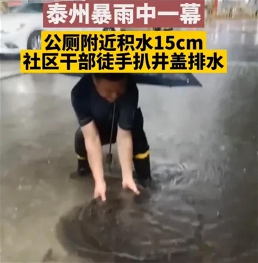 该视频是由当地媒体发布在短视频平台上,视频下方的文字说明称:7月6日下午,泰州突降暴雨,泰州市海陵区城中街道高桥社区的陵园路北侧发生了15厘米的积水,社区的工作人员前往排涝,社区副书记曹红春更是徒手扒开井盖排水,他全身都湿透了。