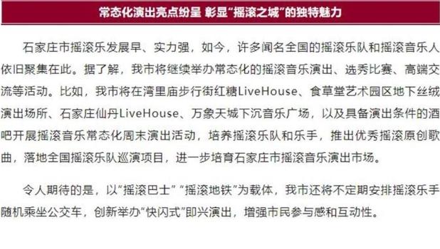 石家庄摇滚音乐节火热启动,各类演出活动助推摇滚文化走进市民生活。市文化广电和旅游局宣布,今年7月至10月,将举办“Rock Home Town”——中国“摇滚之城”音乐演出季。通过举办大型演出活动和公益惠民演出,力求打造中国摇滚之城。