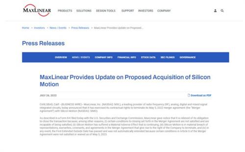 7月27日消息,美国宽带通信芯片商迈凌科技发布通告称,已经终止收汇慧荣科技的计划,此次价值38亿美元的潜在交易彻底终结。在过去的一年中,这一起交易已经走完了大部分的法律审核程序,最后一道程序是中国市场的反垄断审核,这一审核在7月26日的晚上,已经由国家市场监管总局正式通过,批准了美国迈凌公司收购慧荣科技公司的计划。