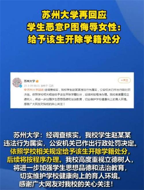 在2023年的3月19日00:30苏州大学官方微博发布了一条通报信息,经过调查核实苏州大学学生赵某的违法行为属实,目前公安机关已经对赵某作出了行政处罚,学校鉴于赵某的违法性质极其恶劣,给予开除学籍的处分,这也意味着p图侮辱女性的赵某已经正式被苏州大学开除了学籍,苏州大学的官方微博称在后续的工作中将会严格按照程序进行办理,同时对于学生的思想品德和法制教育要进一步的加强,坚决杜绝此类事件的再次发生,同时也要从根本上维护学校健康向上的育人环境。