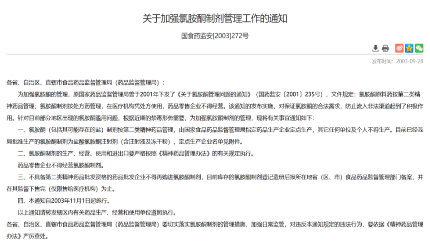 最早氯胺酮是用静脉全麻类的一种药品,直到今天来看氯胺酮,也是医院里经常所使用的麻醉剂类型,氯胺酮的名字为人所熟知是因为在上世纪的八九十年代,氯胺酮摇身变成了熟知的一种毒品类型K粉,2001年国家药监局将氯胺酮的原料药品作为第2类精神类药品作出管控,2003年公安部曾经公开宣布了氯胺酮是毒品的范畴。