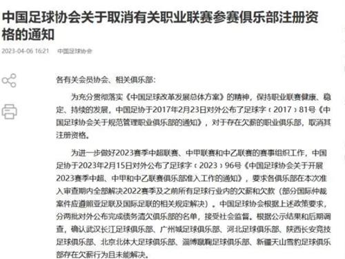 中国足球协会在2023年的2月15号就通过官网对外宣布了关于《中国足球协会对于开展2023赛季中超中甲和中乙联赛俱乐部的注册工作》通知。在这份通知中就很明确的要求参与三种联赛的各个足球,俱乐部在本次的审查期内,一定要全部解决关于2022赛季以及之前赛季中所有的欠薪,包括欠款的行为。只有全部清算完毕之后,才能够获得注册资格。