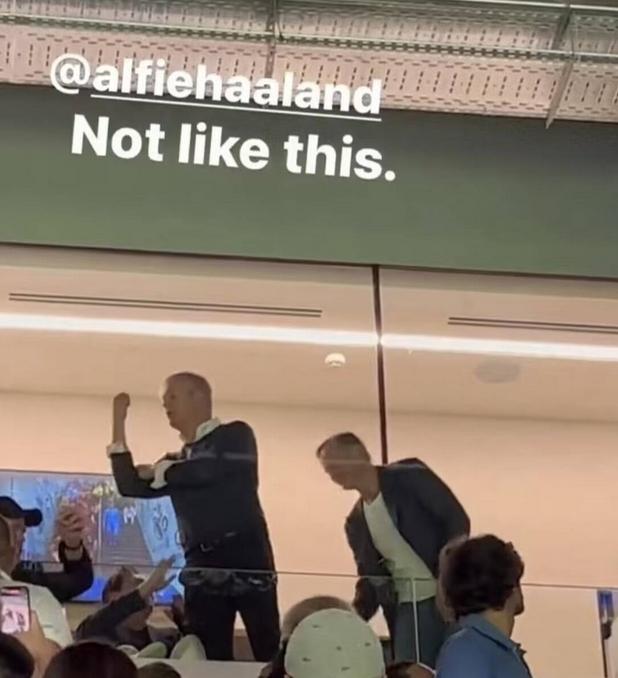据报道,哈兰德的父亲阿尔菲-哈兰德到场观战,但很快就受到了皇马球迷的辱骂,并向球迷投掷了食物以进行还击。由于此行为被球场保安发现,哈兰德的父亲最终被带离了伯纳乌的包厢。