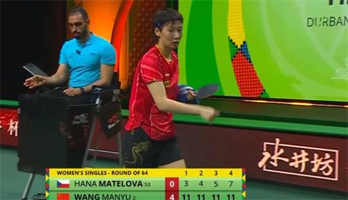 在首局比赛中,王曼昱就表现出了很好的调动性,完美的发球,稳定的发挥,在开局王曼昱就7-0领先对手,在之后的比赛时间内,王曼昱根本没给对方任何机会,马特洛娃几乎没怎么碰到球,第一局的比赛就结束了,王曼昱11-2轻松拿下。第二局马特洛娃一直在增强状态,面对她的高质量球王曼昱都能接住,很快开始反攻,能感觉到马特洛娃自己都绝望了,王曼昱连续得分最终11-4再次获胜。