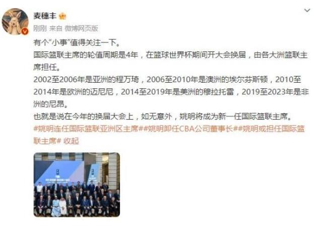 根据5月25日的报道,中国篮协主席姚明在连任国际篮联亚洲区主席后,被视为有望成为新一任国际篮联主席。这一消息引起了媒体的广泛关注。