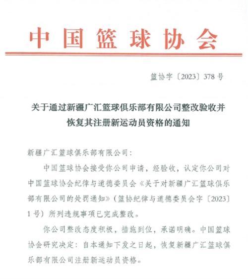 北京时间2023年6月9日,中国篮协发布通知,宣布通过对新疆广汇篮球俱乐部有限公司的整改验收,恢复了该俱乐部的注册新运动员资格。