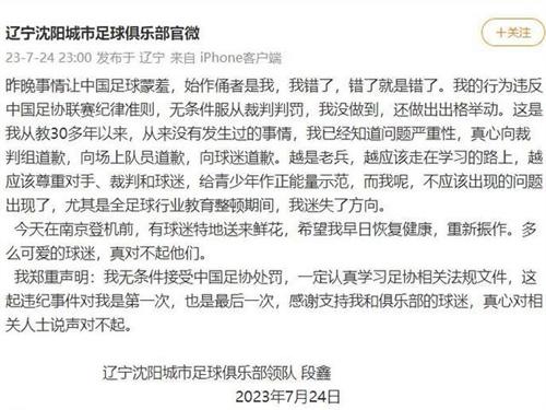 北京时间7月25日,中甲联赛的沈阳城市球队发布了相关的公告,对于之前沈阳城市领队段鑫在比赛场上做出的国长裁判的行为,做出一系列的处罚。现在对他的领队位置进行暂停,同时还要求其他的教练成员一起学习相关的文化知识,贯彻体育总局发布的一些体育方针,确保他们比赛场上不会出现不理智的行为。沈阳城市球队表示无条件的接受裁判对于他们的任何判罚,即便是出现了一些有争议的判罚,也会用更加理智的方式进行讨论和申诉。
