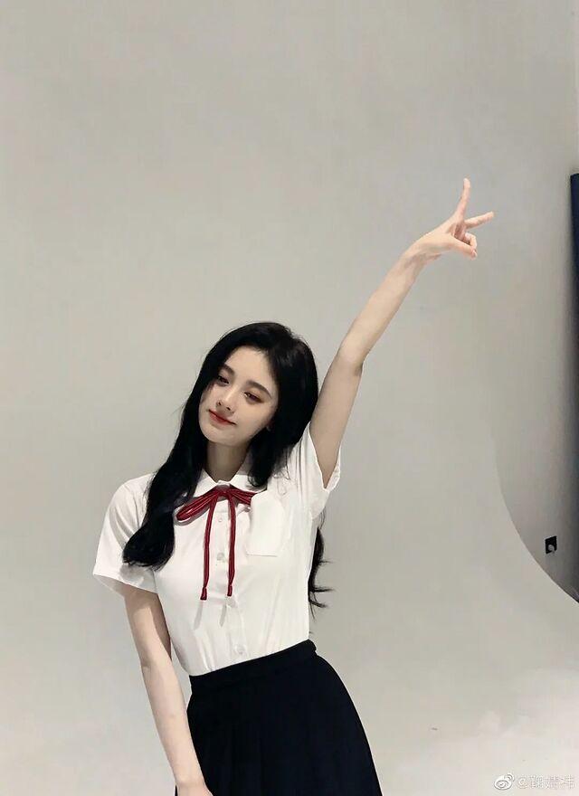 这种蝴蝶结丝带衬衣,娜扎之前也有晒过穿搭,搭配一个(看起来随意的)丸子头,一下变身高中生女孩。