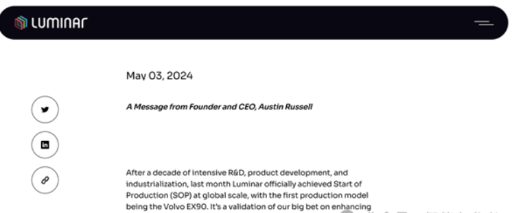 5月4日消息,激光雷达头部玩家luminar正式对外官宣生产转外包,整个公司裁员20%,后续将全面转型,Luminar公司CEO表示,公司做出这项决定,是为了保证公司在市场中的领先地位。为了能够最大化成功的实现长期目标,不得已而这样做。