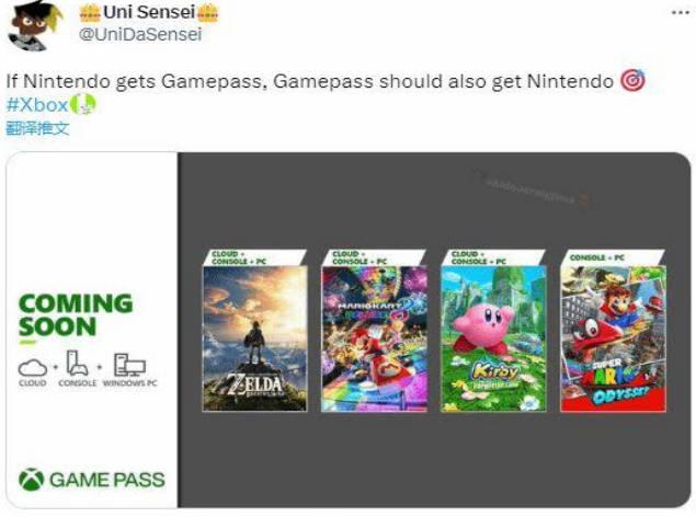 其中一名推特的用户就表示如果任天堂可以获得game pass的话,那么game pass应该也加入任天堂里面的游戏,并且配了一张《野炊》《马车8》一系列游戏,进入到game pass的一张恶搞的图片。