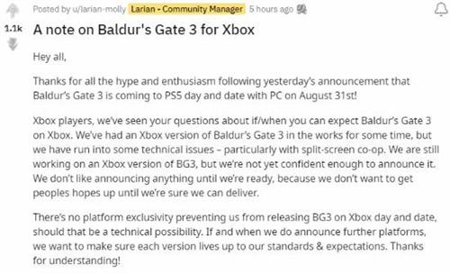 2. 《博德之门3》表示晚一些会推出XBox的版本